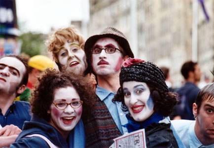 Every August Edinburgh transforms from a beautful and peaceful city into a vibrant lively city as the Edinburgh Festival arrives. Thousands of performers decend upon the city and entertain for a whole month. I had walked to the Royal Mile during a lunch hour with the intention of taking some candid shots of people enjoying the street performances and couldn't resist asking the chap in the middle for his photo. The whole posse wanted to join in the shot and I clicked off one shot to appease them feeling I had lost the moment. What a surprise when I got the film back - a moment captured!